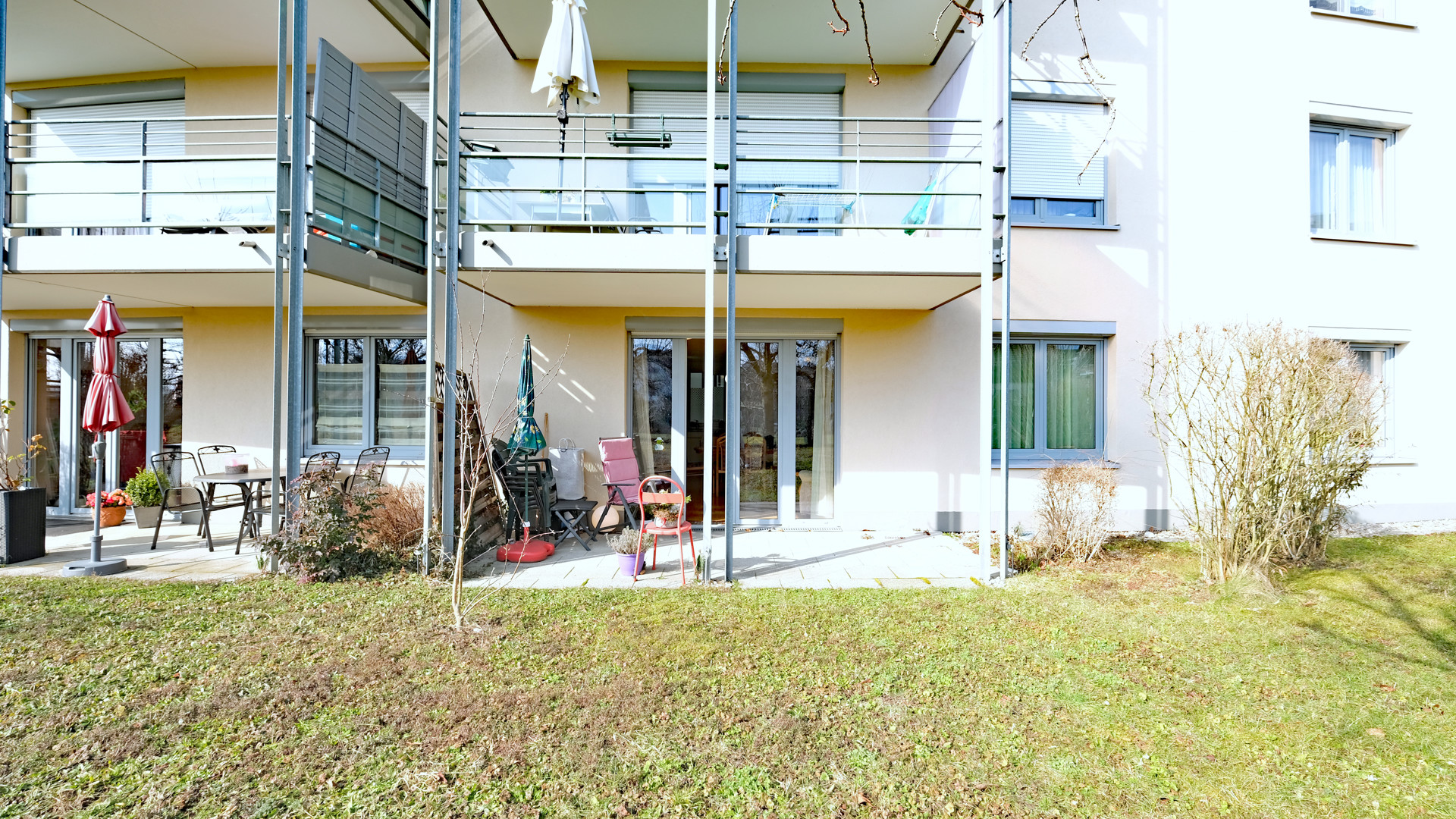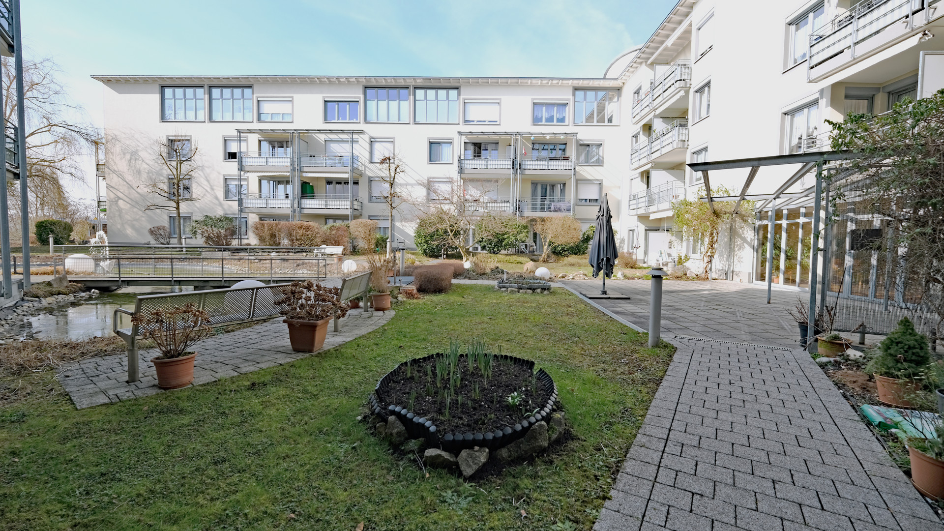 Ein besonderes Highlight dieser Wohnung ist die großzügige Terrasse, die direkten Zugang zum Garten bietet. Zudem befindet sich zwischen den Gebäuden eine großzügig angelegte Gartenanlage mit großem Karpfenteich, Außenterrasse und Ruhebänken für gesellige Stunden.