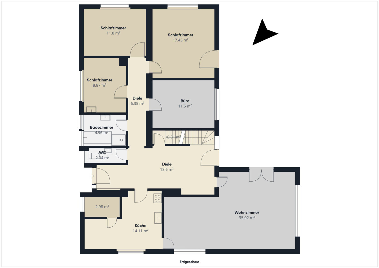 Das Erdgeschoss empfängt Sie mit lichtdurchfluteten Räumen: vier Schlaf- bzw. Arbeitszimmer, ein großes Wohnzimmer mit Essecke, eine helle Küche mit Essbereich, ein großzügiger Flur, ein Bad und ein separates WC. Edles Holzparkett im Wohnzimmer und Solnhofener Platten im Flur verleihen dem Haus besonderen Charme.