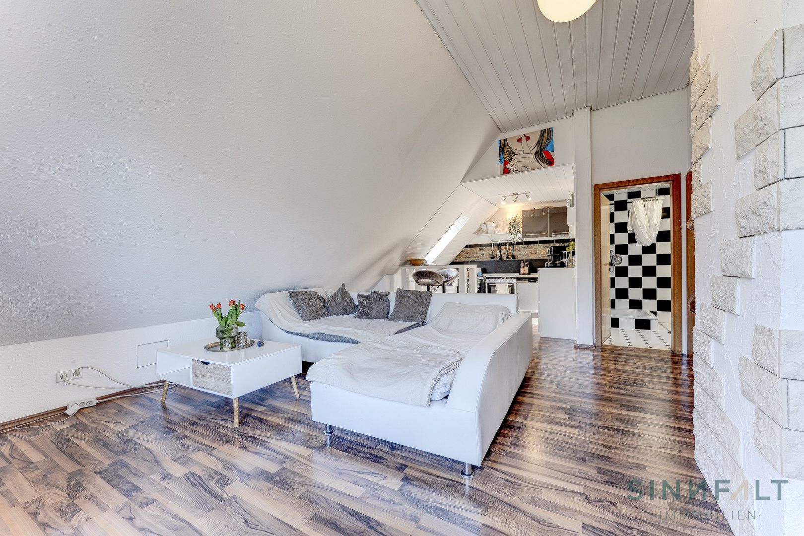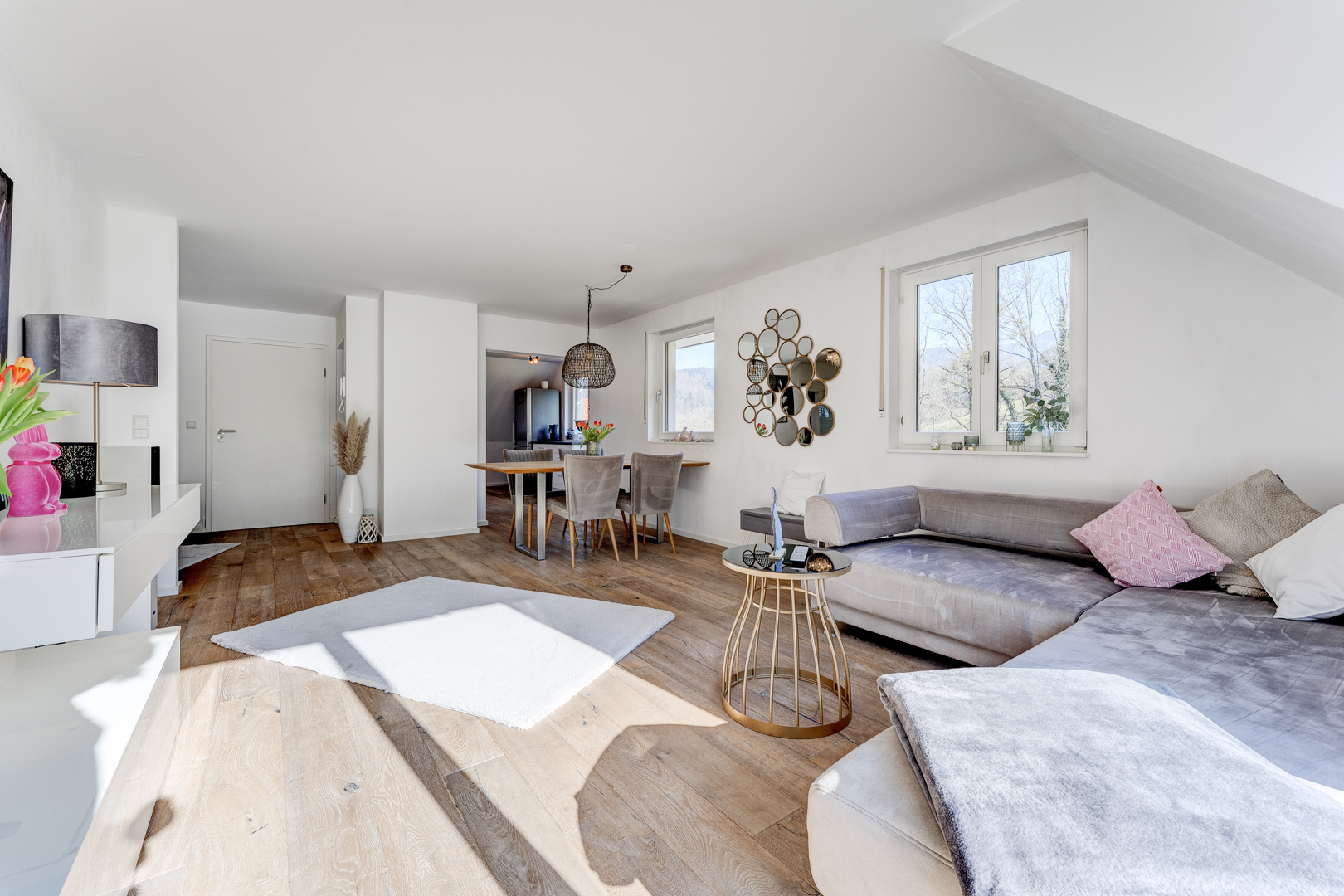 Das dazugehörige Appartement im Dachgeschoss hat eine Fläche von ca. 38,78 m² und bietet ebenfalls einen Balkon mit wunderschöner Aussicht. Hier finden Sie ein schickes Bad und neue Fenster, die 2019 installiert wurden. Ein Kaminofen kann problemlos integriert werden, was für zusätzliche Gemütlichkeit sorgt. Die offene Küche und der großzügige Wohn- und Schlafbereich schaffen eine einladende Atmosphäre, während hochwertiger Laminatboden und Fliesen den Räumen einen modernen Touch verleihen.