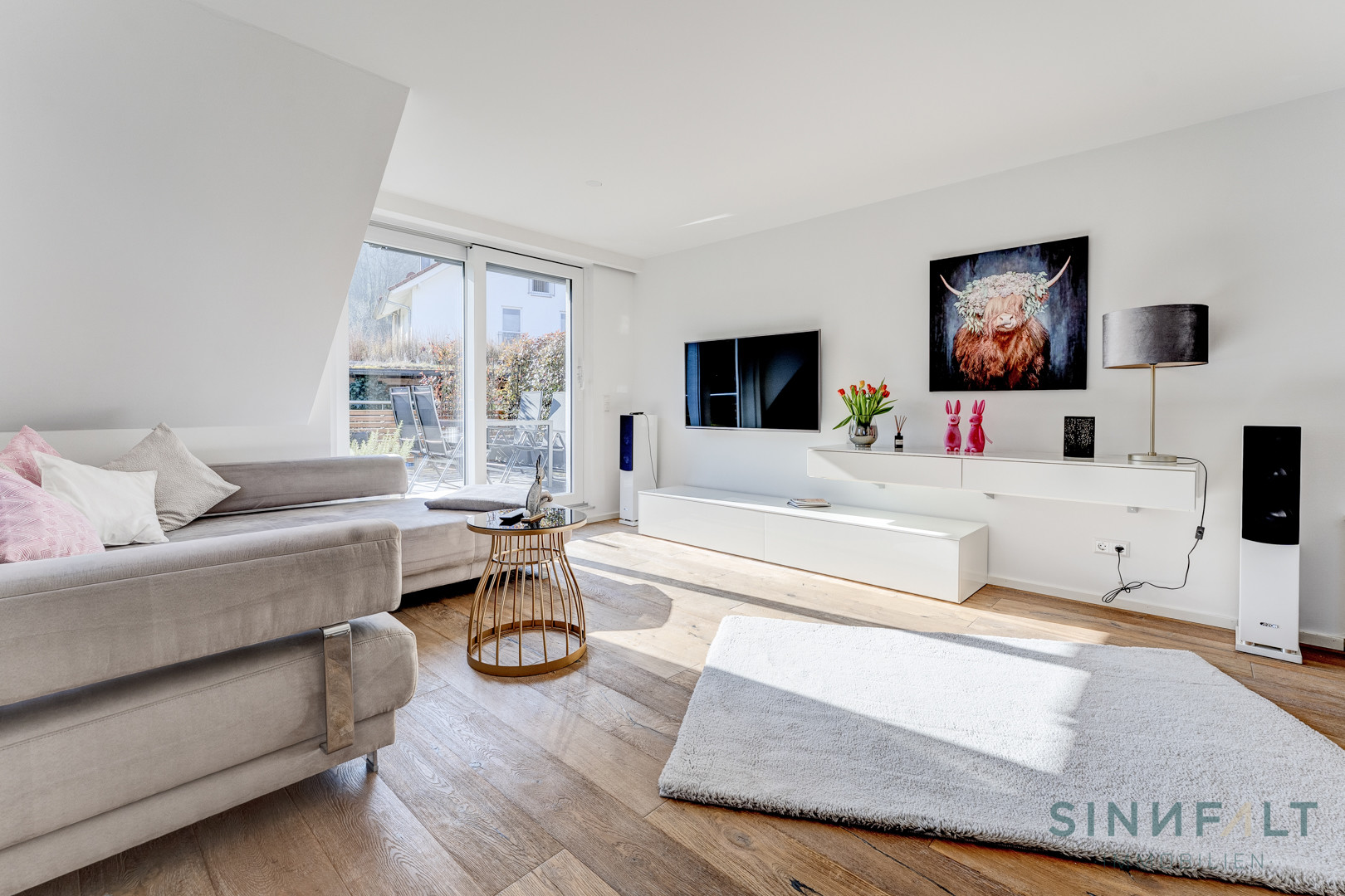 Die moderne, offene Küche bietet viel Platz und lädt zum gemeinsamen Kochen ein. Die Wohnung wurde 2019 komplett saniert und ist mit einer Fußbodenheizung ausgestattet, die für ein angenehmes Wohnklima sorgt. Stilvolle und moderne Gestaltungselemente finden sich sowohl im Bad als auch im Gäste-WC.