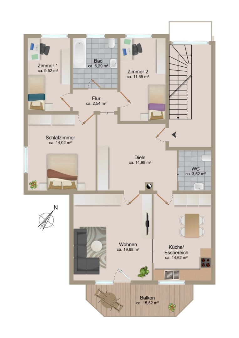 Ein besonderes Highlight ist der harmonische Grundriss, der ein angenehmes Wohngefühl schafft. Auf ca. 102 m² Wohnfläche stehen Ihnen drei Schlafzimmer, eine separate Küche mit Essbereich, ein Badezimmer sowie ein zusätzliches Gäste-WC zur Verfügung. Die Räume können flexibel als Schlafzimmer, Kinderzimmer oder Homeoffice genutzt werden. Ob für Familien, Paare oder Singles - diese Wohnung bietet ausreichend Platz für individuelle Nutzungsmöglichkeiten.